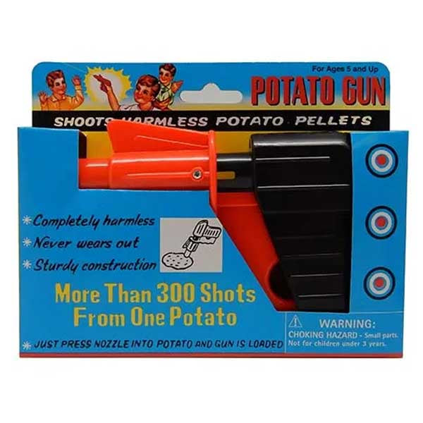 The potato gun shoots harmless potato pellets. Just press nozzle into potato and the gun is loaded. Completely harmless. Sturdy construction. Easily pulls apart for easy cleaning.