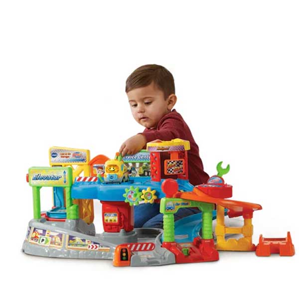 his interactive Garage play set includes a cute Tow Truck vehicle that features a real tow hook, 3 songs and 6 melodies! Drive up and around the two levels of play using the lift, clean the truck at the car wash with the spinning brushes or get a service at the repair stand with moving spanner! Garage includes three chunky light up buttons that introduce colours, objects, fun phrases and tunes. Includes 9 SmartPoint locations.