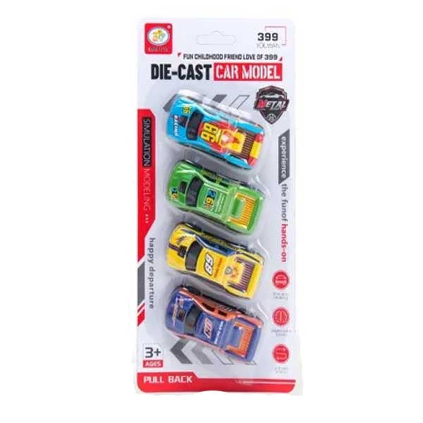 Set of 4 pull back die-cast trucks. Colourful, race designs to collect.